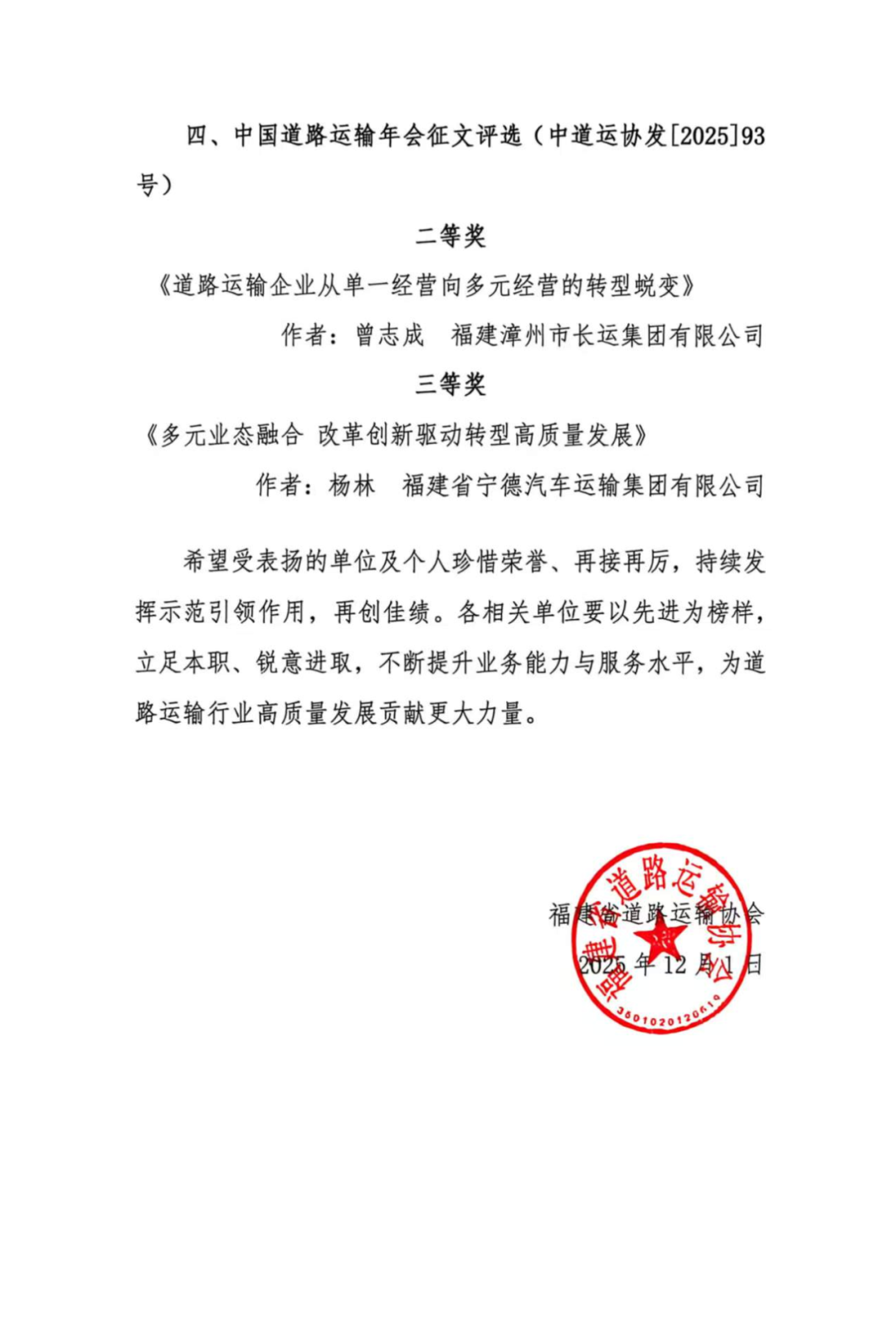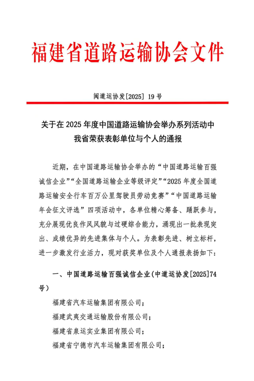 关于在2025年度中国道路运输协会举办系列活动中我省荣获表彰单位与个人的通报